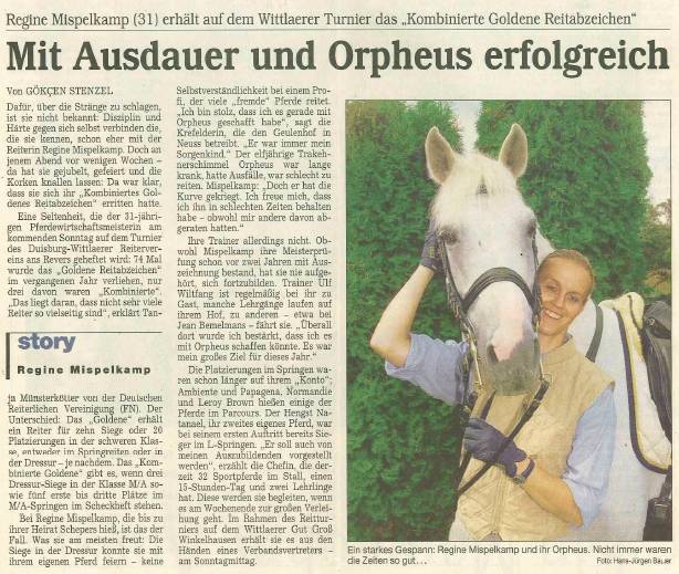 Im August 2002 erhielt Regine Mispelkamp das goldene Reitabzeichen, zu dem auch „Leroy Brown“ das Seinige beigetragen hatte, als Höhepunkt des Sommerturniers auf Gut Großwinkelhausen in Wittlaer.